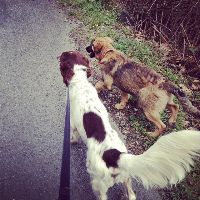 Bir baktık önümüzde bir çift, Alman Kurt köpeklerini yürütüyorlar. Kurt serbest dolaşıyordu. Coffee’yi görünce hemen geliverdi yanımıza. Coffee ve Gonzo tanışıp koklaştıktan sonra arka arkaya yürümeye başladık. Baktım Gonzo durup durup Coffee’ye doğru gelmek, sahipleri de yola devam etmek istiyor. Yürüyüş yolumuzu değiştirip yandaki siteye doğru gireyim diye düşünürken sitenin bahçesinden kafasında kaskı, altında bisikleti 6-7 yaşlarında bir oğlan fırladı. Önce Gonzo’yu gördü. Bisikleti yan çevirip durdu.