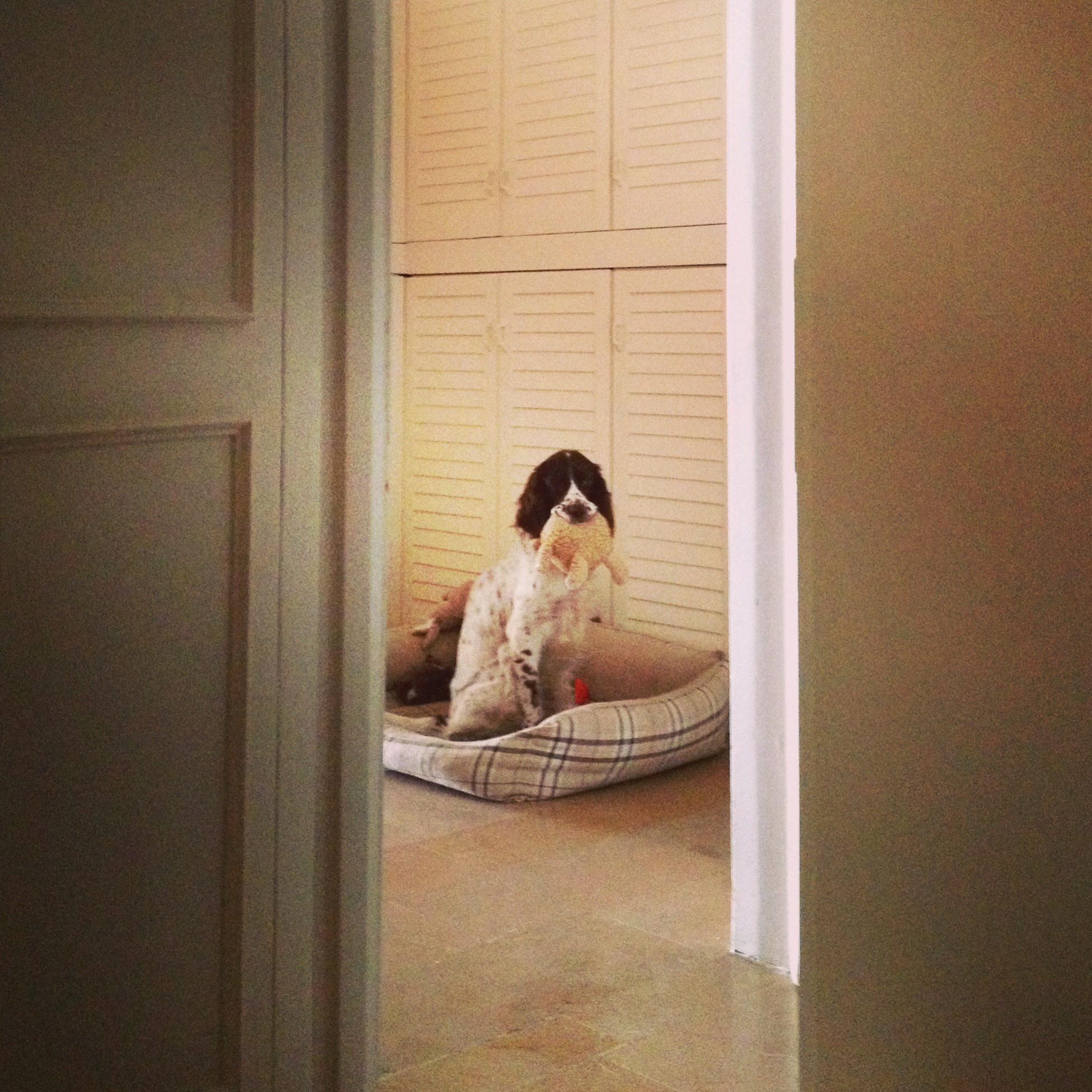 Evdeki düzende Coffee’nin yatağı koridorda konuşlanmış durumda, fakat yatak bizim odamızdan rahatlıkla görülebiliyor. Kapımız her zaman açık. Bazen çok yorgunsa bizden önce gidip yatak odasına yatağın yanına, yere ilişiyor. Kafasını örtünün altına, bazen de bizzat yatağın altına sokuyor. Biz yattıktan sonra bu pozisyon değişebiliyor. Bazen kalıyor bazen kendi yatağına geçiyor. Değişmeyen tek şey sabah seremonisi.