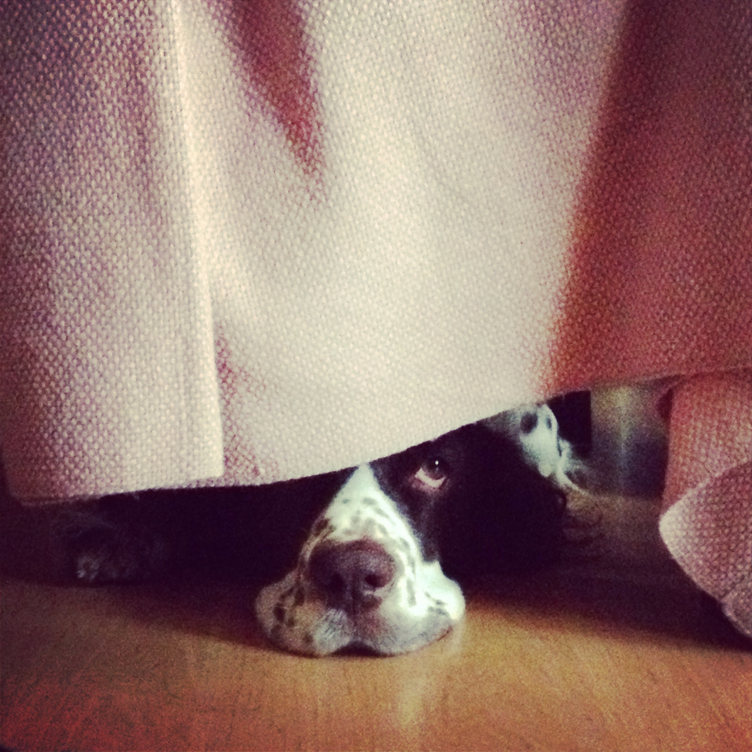 Çocuklardan bağımsız olarak, köpekler altına sığınacakları korunaklı bir alanı seviyorlar. Masa sığınılacak tek ‘dam’ değil onlar için. Evde ve iç mekanlarda her türlü sehpa, sandalye, koltuk, kanepe, yatak, döşek bu işlevi görebiliyor. Hatta bu ‘dam’ın illa katı bir malzeme olması da gerekmiyor. Bazen bir örtü oluyor, bazen bir perde veya bir mobilya eteği. Bütün vücut dışarıda kalsa bile kafadan yukarısı birşeyin altına saklı kalmışsa o gizemli ve korunaklı dünya kurulmuş, büyüsü çalışmış oluyor.