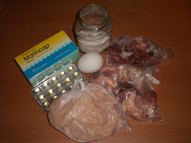 – yüzde 80 Kemikli etler (tavuk, kuzu, dana, domuz, balık, tavşan, av hayvanı eti, yürek, dil, kas, deri, doku, yağ vb.)